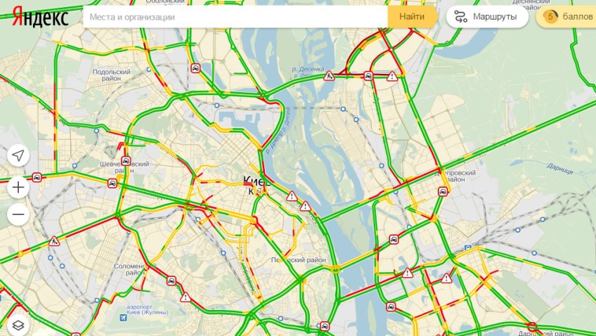 Согласно карте пробок Яндексе, сильные пробки не только на левом берегу столицы.