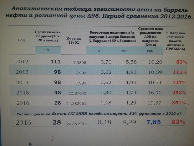 Средняя цена реализации бензина марки А-95 с учетом наценки в 83% должна составлять 7,85 грн за литр.