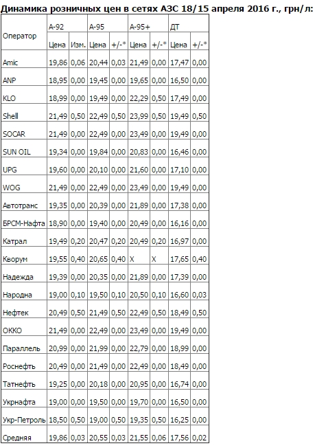 Как сообщал OilNews, 8-10 апреля консолидированная сеть АЗС группы «Приват» подняла цены на все виды топлива на 50 коп./л. Следом за ней цены на 50 коп./л выросли в сетях ОККО и WOG.