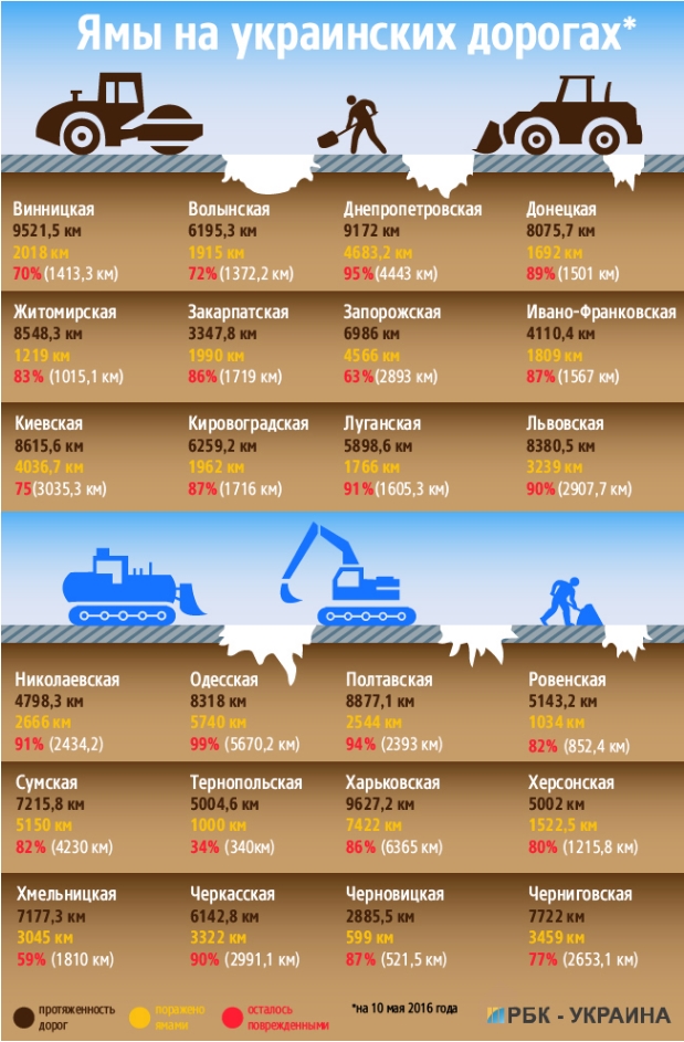 Напомним, что в этом году из госбюджета на ремонт дорог запланировано ни много ни мало 19 млрд грн. Однако более половины этой суммы уйдет на погашение кредитов. На непосредственные нужды дорожником останется 2,5 млрд грн - на ямочный ремонт и 3,5 млрд гривен – на средний ремонт. Но даже из эти средств за первые четыре месяца 2016 года перечислено только 13% от запланированного – 767 млн., причем две трети от этой суммы поступило лишь в апреле, - сообщает «РБK-Украина» .