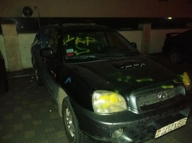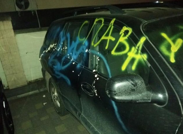 В центре Львова разрисовали автомобиль с белорусскими номерами, в котором висела георгиевская ленточка. Неизвестные попытались нарисовать на машине сине-желтыми красками "Слава Украине", и скрылись.