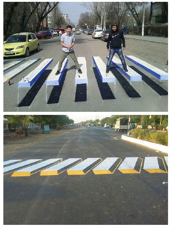 Получилась, высококачественная оптическая иллюзия, которая заставляет водителей тормозить перед переходами.