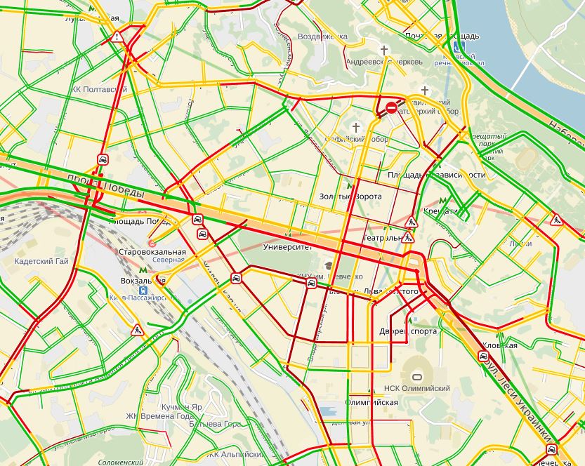 Традиционно стоит улица Черновола в обе стороны с движением со скоростью 5-7 км/час, бульвар Шевченко аж до Бессарабки (5км/ч), спуск бульвара Леси Украинки со стороны Печерска (5 км/ч).