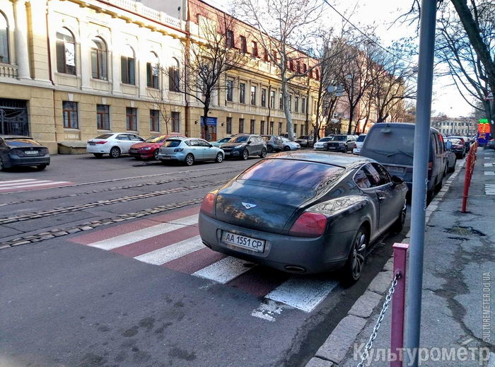 Напротив одесской школы №37 на Софиевской вчера припарковался элитный автомобиль Бентли прямо на пешеходном переходе. Более того — водитель прекрасно видел, что тротуар от проезжей части разделен забором и чтобы перейти улицу нужно будет протискиваться между Бентли и забором. Куда же приехал такой наглый водитель? Свидетель инцидента одесский художник Кирилл Бондаренко считает, что скорее всего в гости к военным прокурорам на другой стороне улицы. К слову, на фото видно, что там уже нет места не только для парковки, но и для пешеходов.