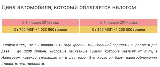 Так как на 1 января 2016 года (по закону, берется именно эта дата) МЗП составляла 1378 гривен, налог платили те владельцы транспорта, у кого машина стоила 1 033 500 грн (при заложенном в бюджет курсе 24,1 грн/доллар - $42 883). С 1 января 2017 года “минималка“ вырасла до 3200 гривен, соответственно, налог будет взиматься с автомобилей, которые стоят 1, 2 млн грн и больше (заложен курс 27,1 грн/доллар - $44 280).