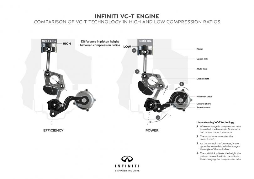 Как поясняют в Infiniti, уникальность технологии VC-T состоит в способности двигателя трансформироваться и плавно регулировать высоту хода поршней в зависимости от потребностей.