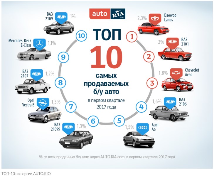 Самым популярным автомобилем стал Daewoo Lanos. В первом квартале 2017 года Lanos занял 2,3% всех продаж сайта. Второе место занял ВАЗ 2101 с 2% доли продаж. На третьем месте оказался Chevrolet Aveo с 1,8% всех продаж, что подняло его в списке популярных б/у автомобилей на три позиции.