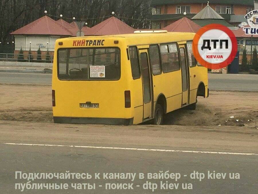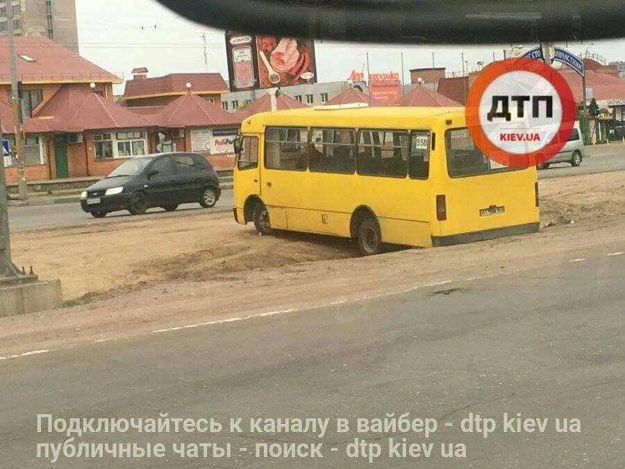 На Кольцевой дороге водитель маршрутки пытался сократить путь и развернуться посреди дороги, но застрял на обочине. Автобус так и остался стоять и ждать эвакуатора.