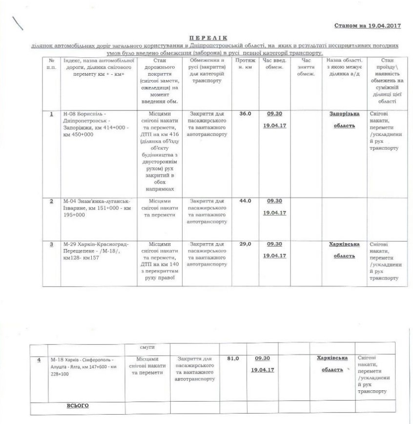Укравтодор в связи с аномальными погодными явлениями (снегопады, порывы ветра - образование снежных накатов и заносов, ДТП с перекрытием движения), принял решение запретить движения пассажирского и грузового автотранспорта на участках автомобильных дорог государственного значения.