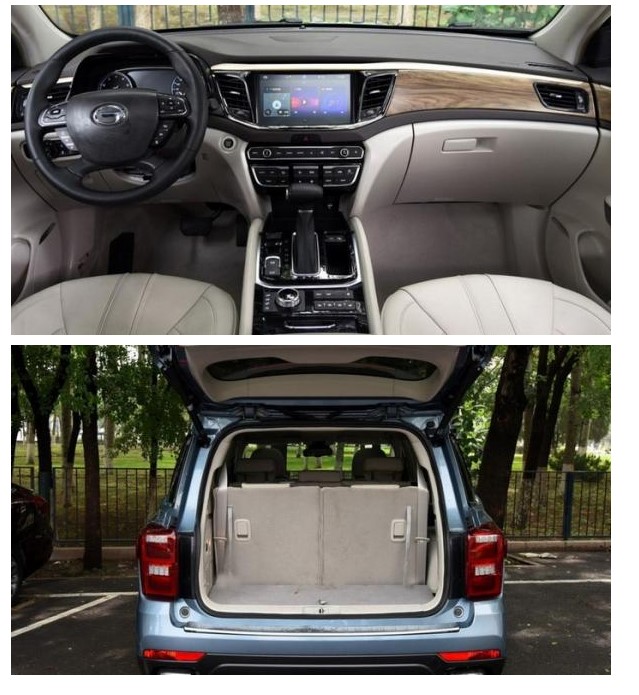 В салоне Trumpchi GS8 – кожа и декоративные вставки «под дерево». Из приятных «наворотов» стоит отметить круговой видеообзор, круиз-контроль, панорамный люк, адаптивный круиз-контроль, ассистент парковки и мультимедийную систему с сенсорным экраном диагональю 10 дюймов. В автомобиле предусмотрены 10 подушек безопасности.