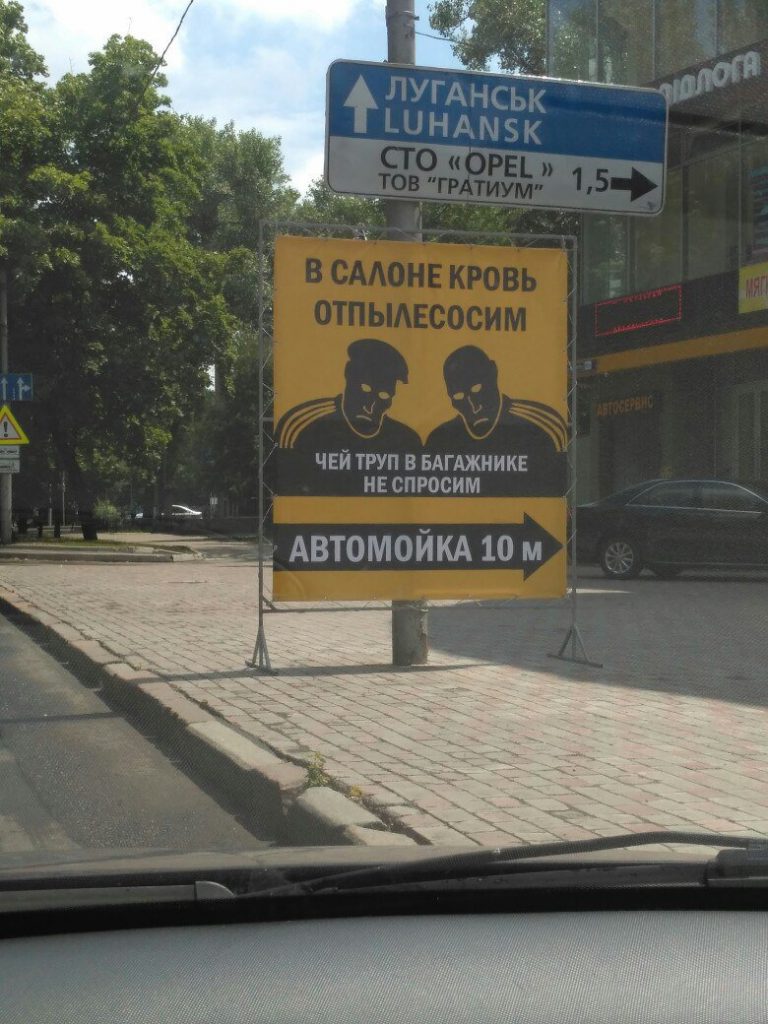 Соцсети поразила своим креативом реклама автомойки в Донецке. Ее владелец по особому решил заинтересовать водителей вымыть свои машины. Фото рекламы разместил на своей странице в Facebook журналист Денис Казанский.