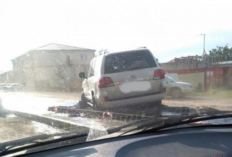 Этот случай – явный тому пример. Владелец Ленд Крузера решил не стоять в пробке, как все, а выехал на только что залитый бетоном участок. Результат – на фото: