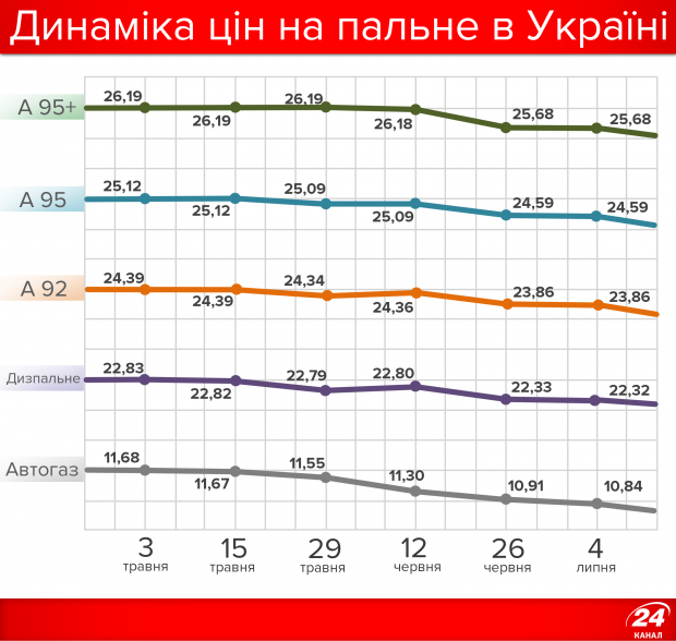 По состоянию на 4 июля, по данным «Консалтинговой группы «А95», средняя цена в Украине на литр бензина А92 составляла 23,86 грн, А95 — 24,59 грн, А95+ — 25,68 грн, дизельное топливо — 22,32 грн, автогаз — 10,84 грн.