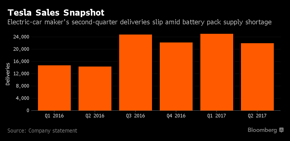 Не успела компания Tesla опубликовать результаты продаж за второй квартал 2017 года, как ее акции подешевели сразу на 7% – до 329,09 долларов, сообщает Reuters.