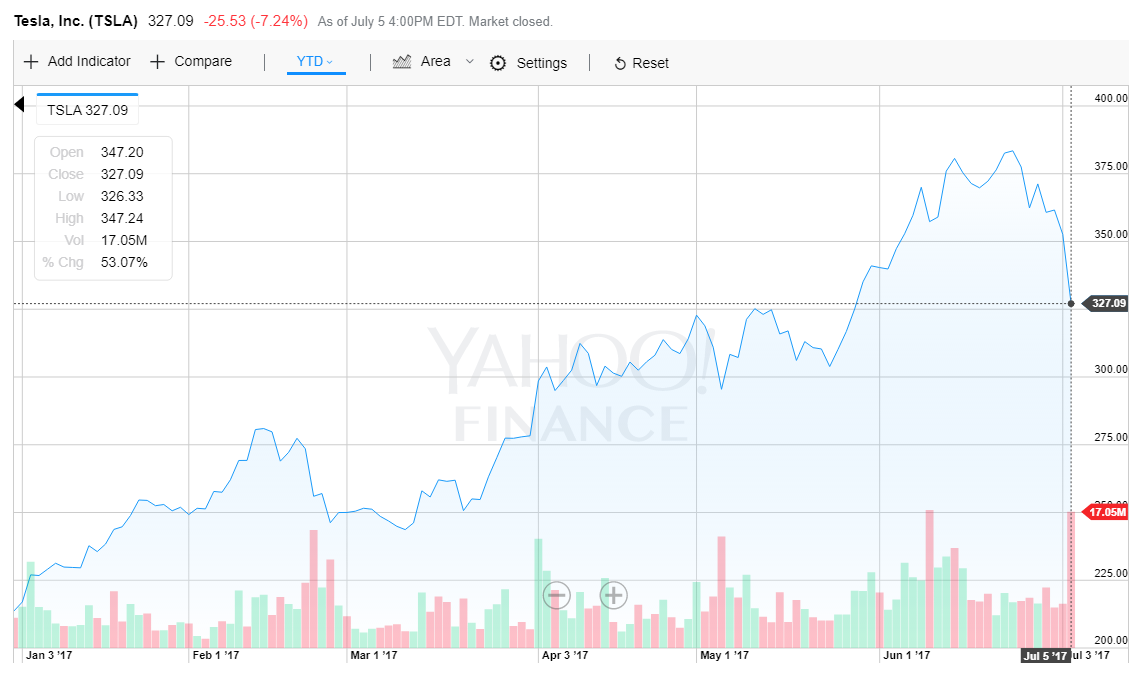 Однако июльское падение акций Tesla не сыграло большой роли на общей финансовой стабильности компании. По итогам первого полугодия 2017-го, акции Tesla поднялись в цене на 53%.