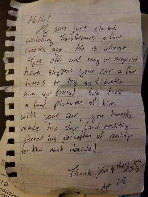 "Мой сын недавно начал смотреть фильмы серии "Трансформеры". Сыну четыре года, и он несколько раз ударил по вашей машине, чтобы разбудить её (простите). Мы сделали несколько фотографий с вашим авто, и он был просто счастлив (и, возможно, это исказило его восприятие реальности на ближайшие десять лет)", — было сказано в записке.