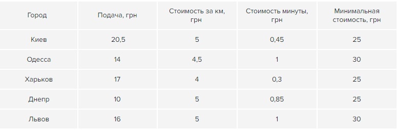 Отпраздновав год работы в украинской столице сервис вызова водителей поднял тарифы на бюджетный UberX. С 8 июля цена за посадку подорожала на 4,5 грн, цена за км пути — на 0,5 грн, а стоимости минуты в дороге — на 0,15 грн. Не изменилась лишь минимальная стоимость поездки.