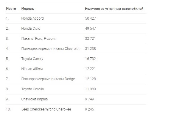Самыми угоняемыми машинами были названы старые модели «Хонды» — в частности, Accord образца 1997 года и Civic 1998 года. На долю именно этих модификаций пришлось около 15 тысяч краж. Вместе с тем Accord и Honda Civic возглавили также общий список — этих моделей всех годов выпуска было украдено примерно по 50 тысяч экземпляров. Топ-3 замкнули пикапы Ford — их украли около 32 тысяч штук.