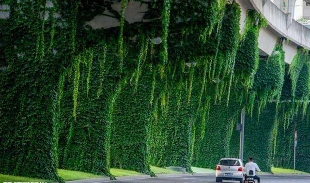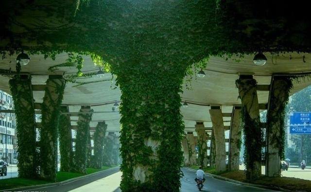 Высокие опоры эстакады в китайском городе Чэнду (провинция Сычуань) поросли девичьим виноградом. Это делает дорогу, проходящую под эстакадой, местами похоже на дикие джунгли.