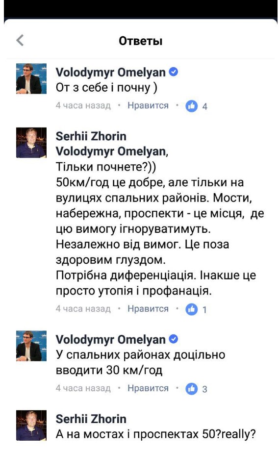 Позже министр инфраструктуры Владимир Омелян предложил снизить максимальную скорость транспорта в спальных районах города до 30 кмм. Об этом он написал в комментарии на своей странице в Facebook в ходе обсуждения намерения Минифраструктуры снизить максимальную скорость транспорта в городах до 50 км/ч.
