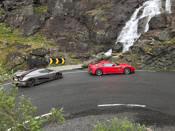 Roll-Royce Sweptail засветился на одной из самых живописных дорог Европы – так называемой Лестнице троллей. Компанию ему на серпантинах составили не менее яркие авто – гиперкары Koenigsegg Agera RS и McLaren P1, а также трековое купе Ferrari F12 TdF.
