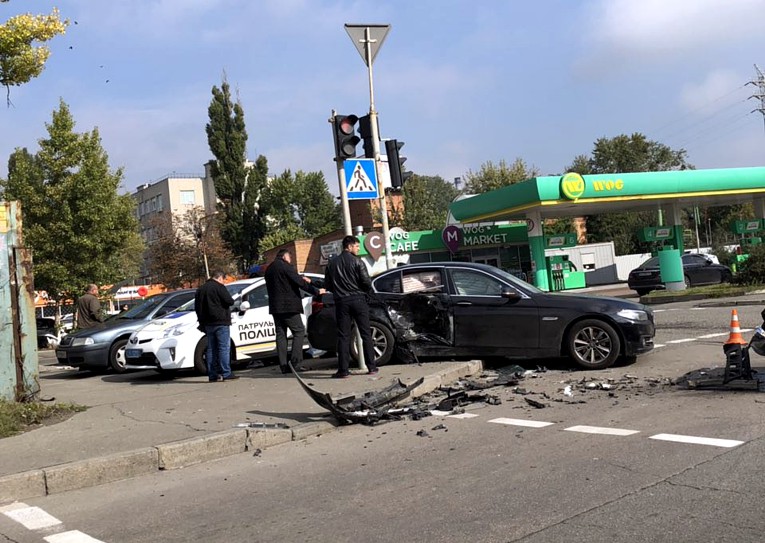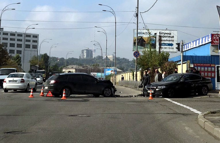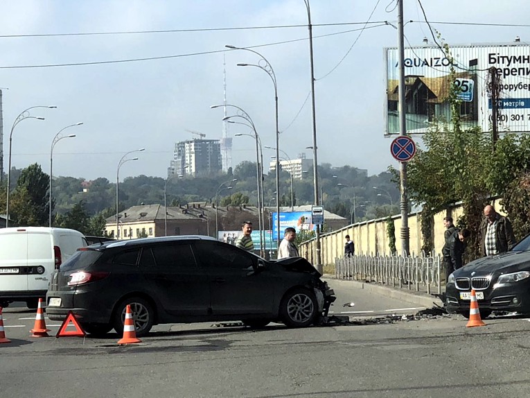 Дорогу не поделили минивен Renault и седан BMW. Инцидент произошел на ул. Набережно-Луговая в Киеве, возле АЗС WOG.
